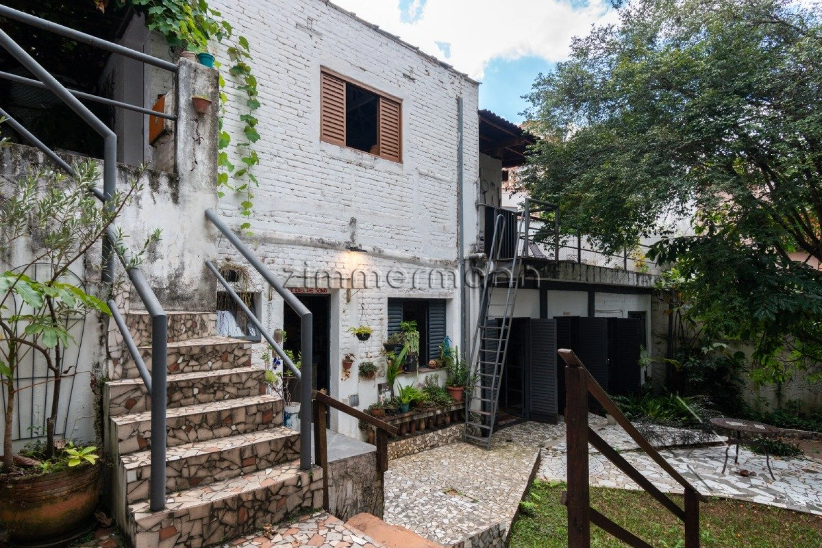 Ao entrar, destacam-se o tijolinho aparente e o piso de madeira, que trazem aconchego. O jardim é um dos pontos fortes, com árvores frutíferas e pergolado com parreiras, criando um espaço agradável e reservado. Há também um mural artístico que adiciona um toque especial ao imóvel.